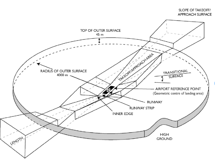 the OLS surround the airport and typically extend out to 15km from the Aerodrome Reference Point (ARP) though this can vary between aerodromes. They are designed to protect aircraft from obstacles when manoeuvring on the ground, taking off, landing or flying in the vicinity of the aerodrome. It is important that these surfaces are not infringed by new development. OLS take the form of a complex set of 3- Dimensional surfaces, which extend upwards and outwards from the runway(s).